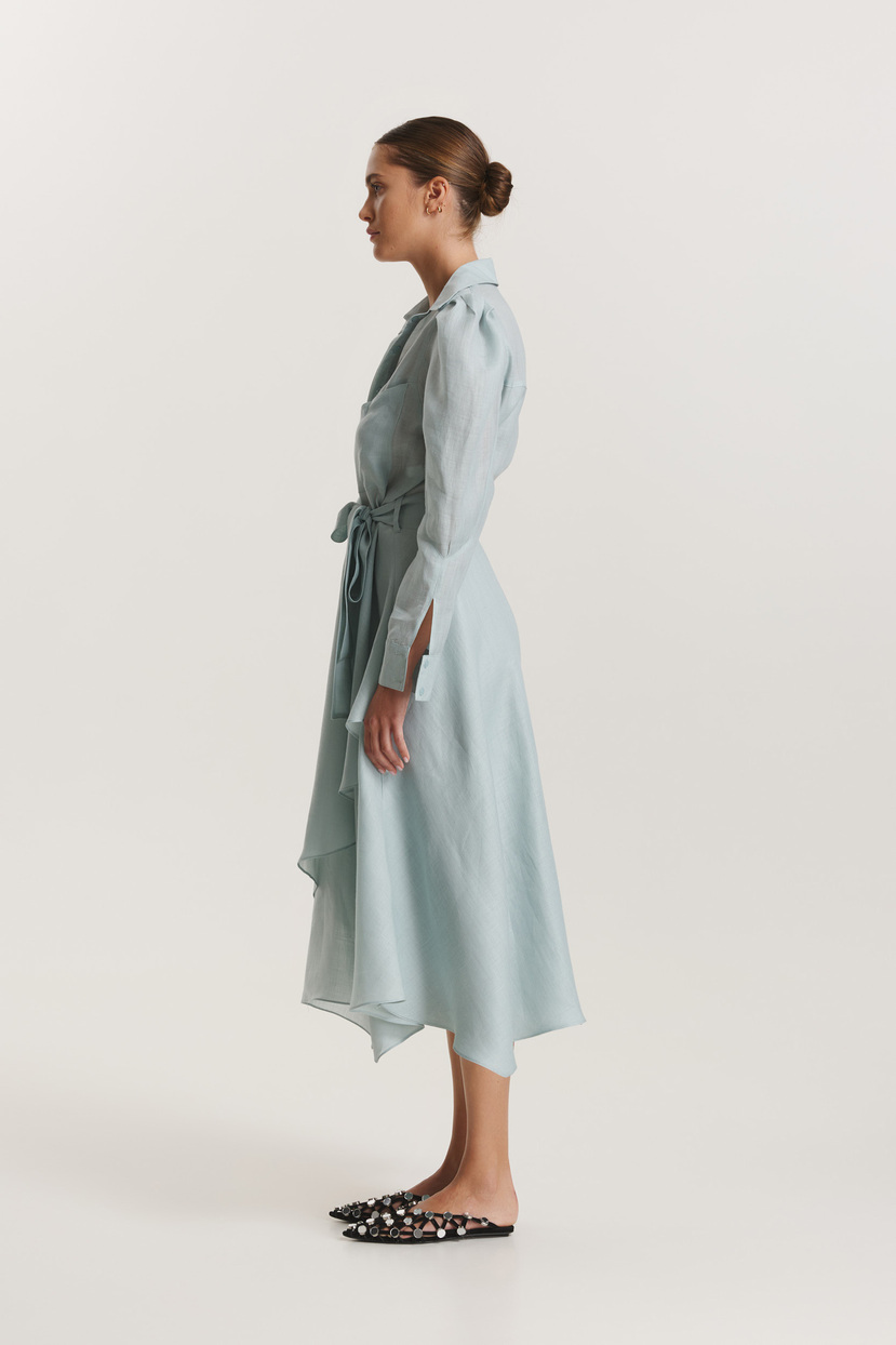 HOME - CLOTHING - Dresses - Midi-Aqua Ruffled Linen Midi Dress - FW25