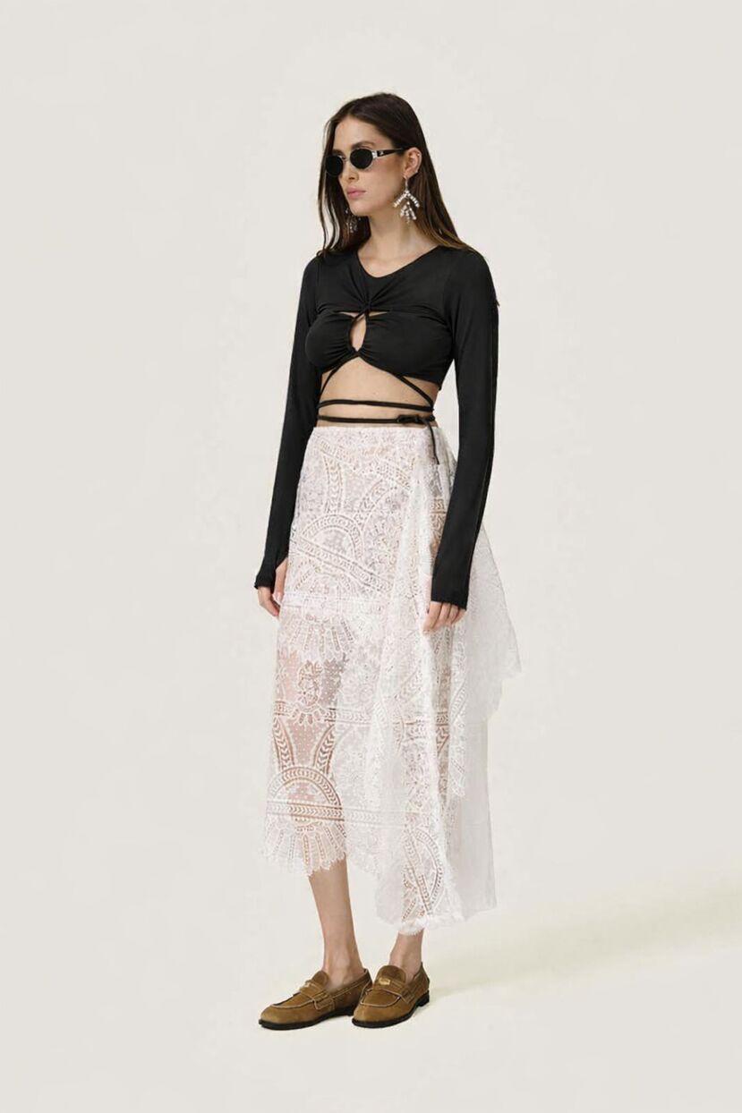 Black Cropped Blouse With a Front Cut-Out Detail And Adjustable Lace-Up Tie