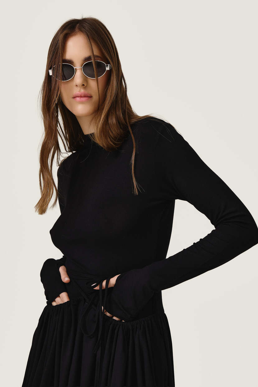Black mini dress with long sleeves and a fitted upper silhouette. The adjustable waist tie defines the figure, while the softly draped skirt adds volume and movement. A modern, feminine piece perfect for casual-chic events or nights out.