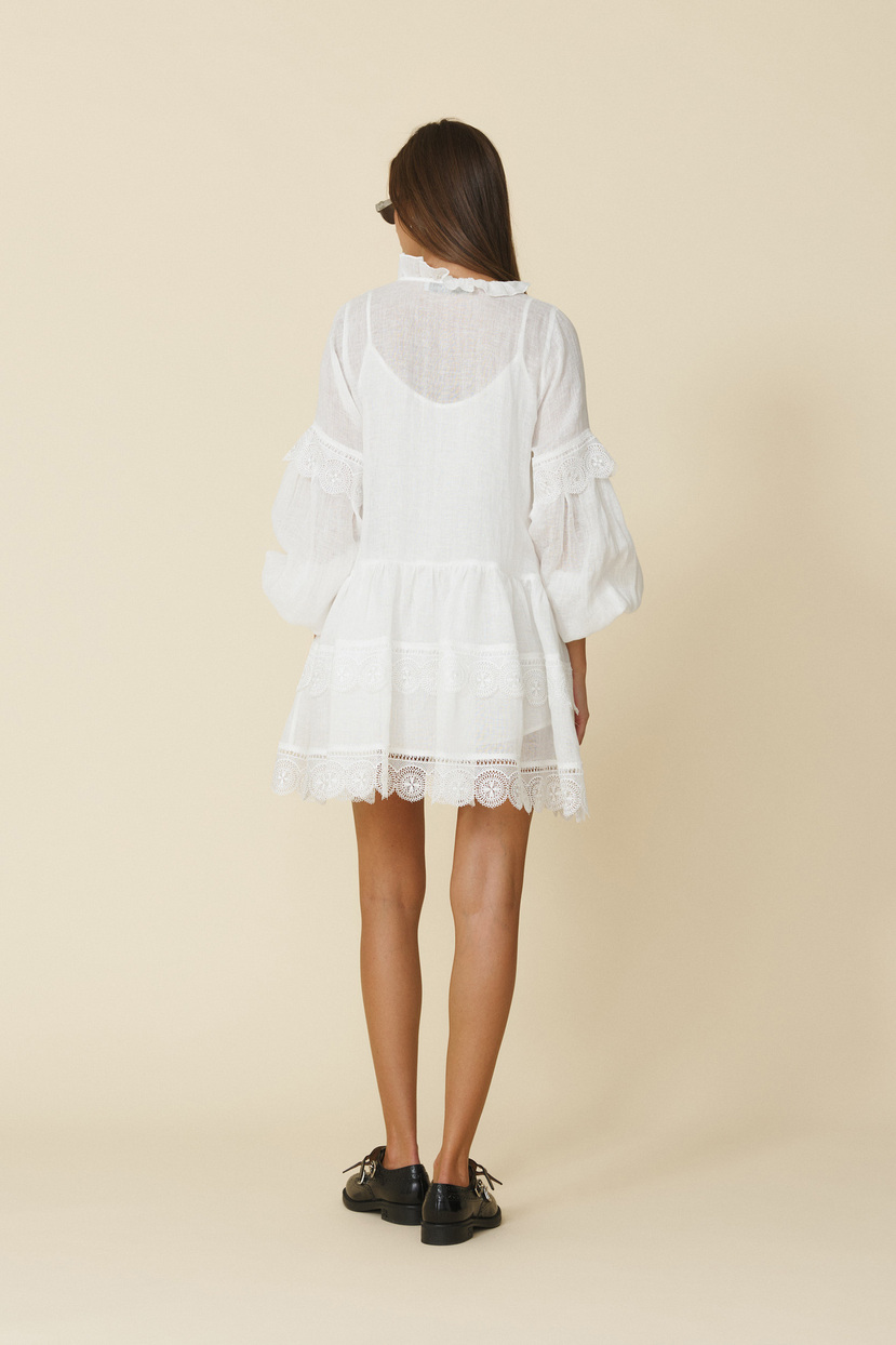 White Linen Mini Dress With Lace Inserts - FW25